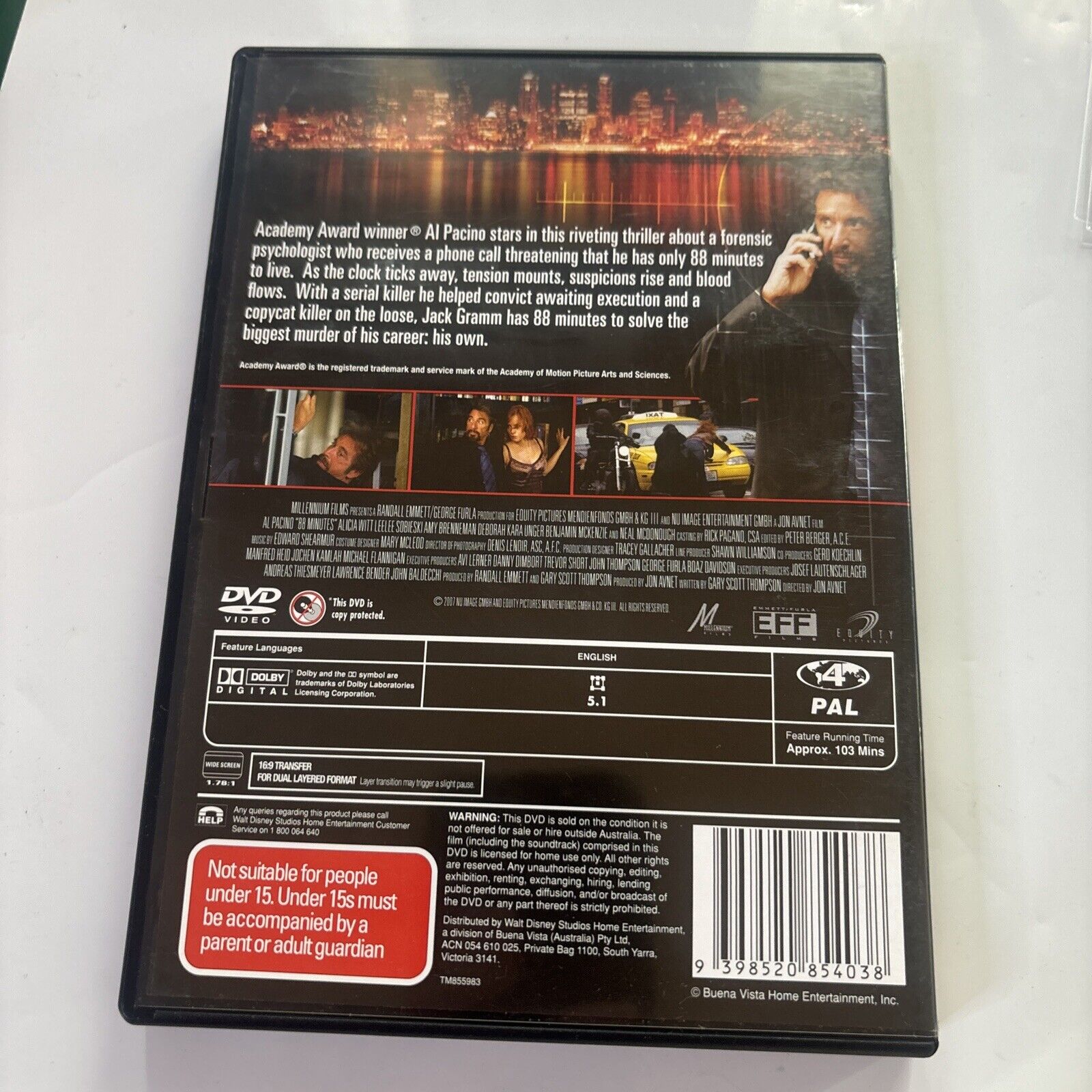 Academy Award winner ® Al Pacino stars in this riveting thriller about a forensic psychologist who receives a phone call threatening that he has only 88 minutes to live. As the clock ticks away, tension mounts, suspicions rise and blood flows. With a serial killer he helped convict awaiting execution and a copycat killer on the loose, Jack Gramm has 88 minutes to solve the biggest murder of his career: his own.
