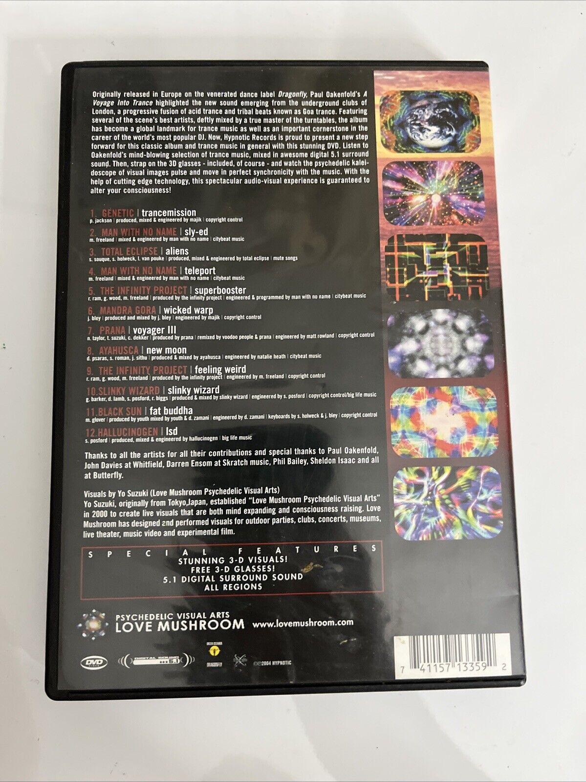 Originally released in Europe on the venerated dance label Dragonfly, Paul Oakenfold's A Voyage Into Trance highlighted the new sound emerging from the underground clubs of London, a progressive fusion of acid trance and tribal beats known as Goa trance. Featuring several of the scene's best artists, deftly mixed by a true master of the turntables, the album has become a global landmark for trance music as well as an important cornerstone in the career of the world's most popular DJ. Now, Hypnotic Records is proud to present a new step forward for this classic album and trance music in general with this stunning DVD. Listen to Oakenfold's mind-blowing selection of trance music, mixed in awesome digital 5.1 surround sound. Then, strap on the 3D glasses - included, of course - and watch the psychedelic kaleidoscope of visual images pulse and move in perfect synchronicity with the music. With the help of cutting edge technology, this spectacular audio-visual experience is guaranteed to alter your consciousness!