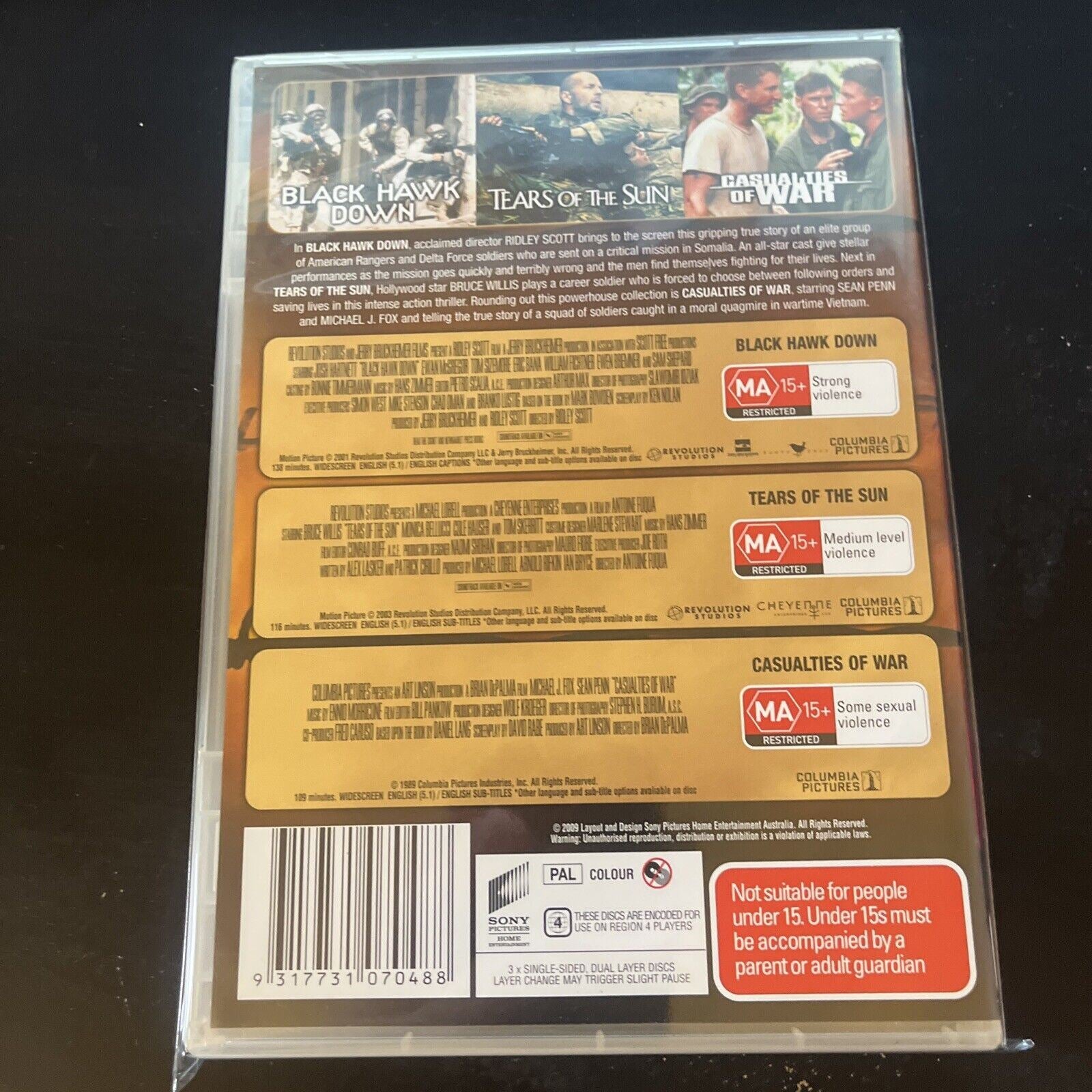 Black Hawk Down / Tears Of The Sun / Casualties Of War (DVD, 3-Disc) Region 4.