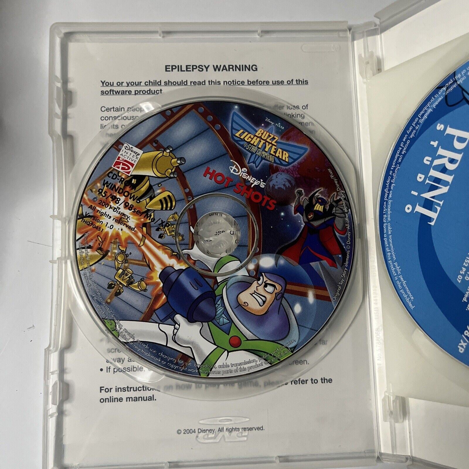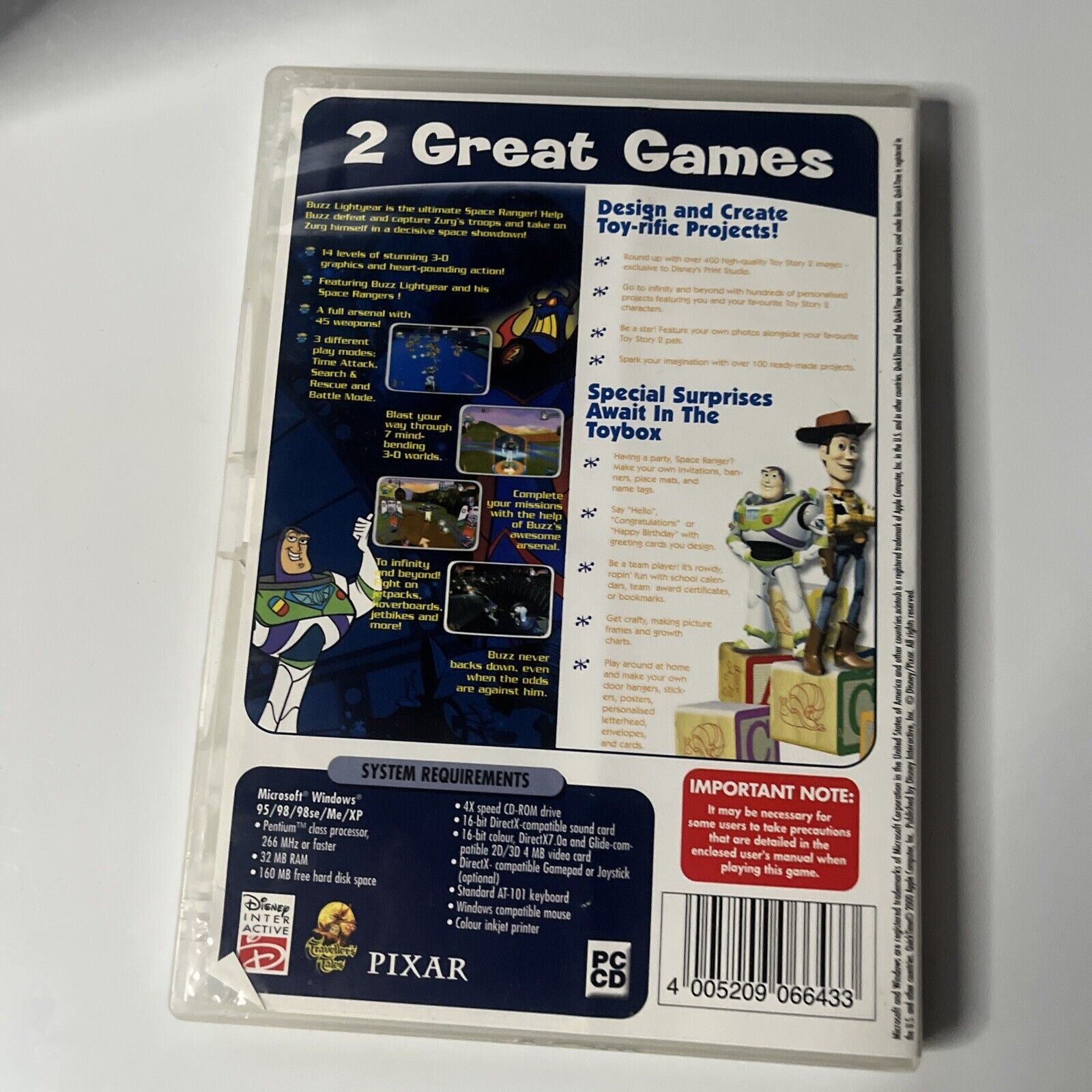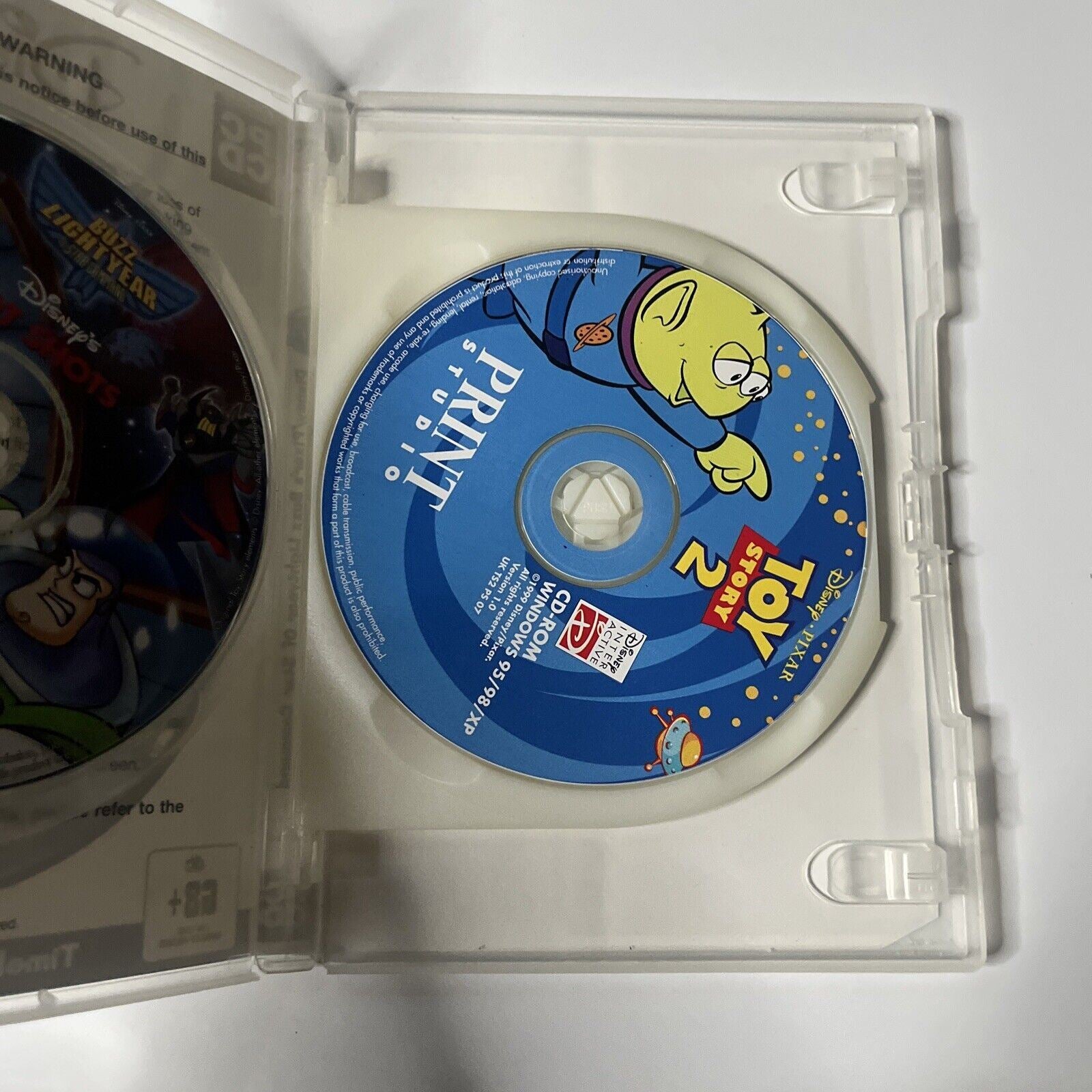 Buzz Lightyear is the ultimate Space Ranger! Help Buzz defeat and capture Zurg's troops and take on Zurg himself in a decisive space showdown! 14 levels of stunning 3-0 graphics and heart-pounding action! Featuring Buzz Lightyear and his Space Rangers! A full arsenal with 45 weapons! 3 different play modes : Time Attack. Search & Rescue and Battle Mode.** Design and Create Toy-rific Projects! * * Se a star! Feature your own photos alongside your favourite Toy Story 2 pals * Spark your imagination with over 100 ready-made projects. * * Special Surprises Await In The Toybox Round up with over 400 high-quality Toy Story 2 images exclusive to Disney's Print Studio ** ** Go to infinity and beyond with hundreds of personalised projects featuring you and your favourite Toy Story characters Having a party, Space Ranger? Make your own invitations, ban ners, place mats, and name tags Say "Hello", "Congratulations or "Happy Birthday with greeting cards you design. Be a team player! It's rowdy, ropin' fun with school calen dars, team award certificates, or bookmarks Get crafty, making picture frames and growth charts Play around at home and make your own door hangers, stick ers, posters, personalised letterhead, envelopes, and cards