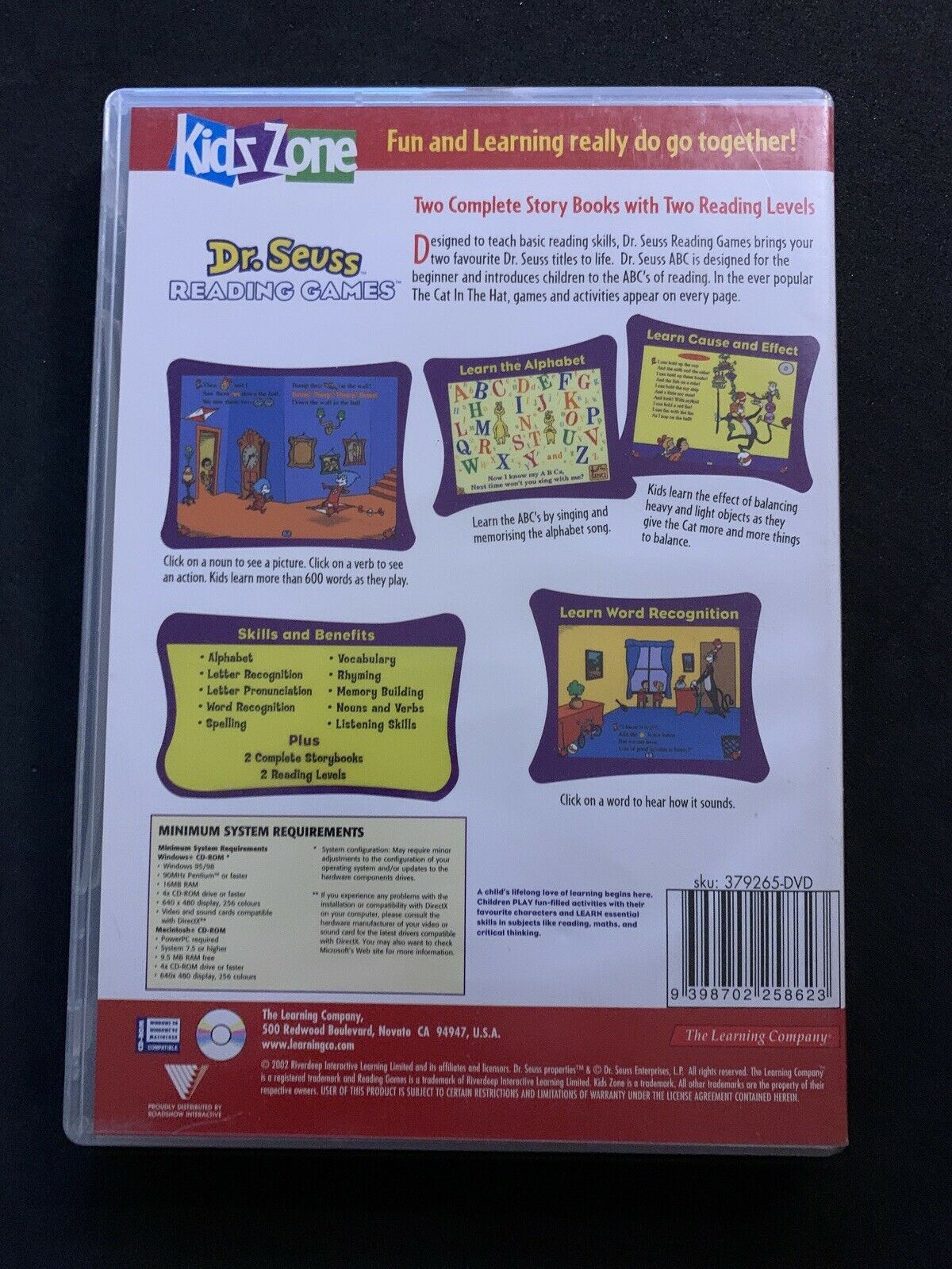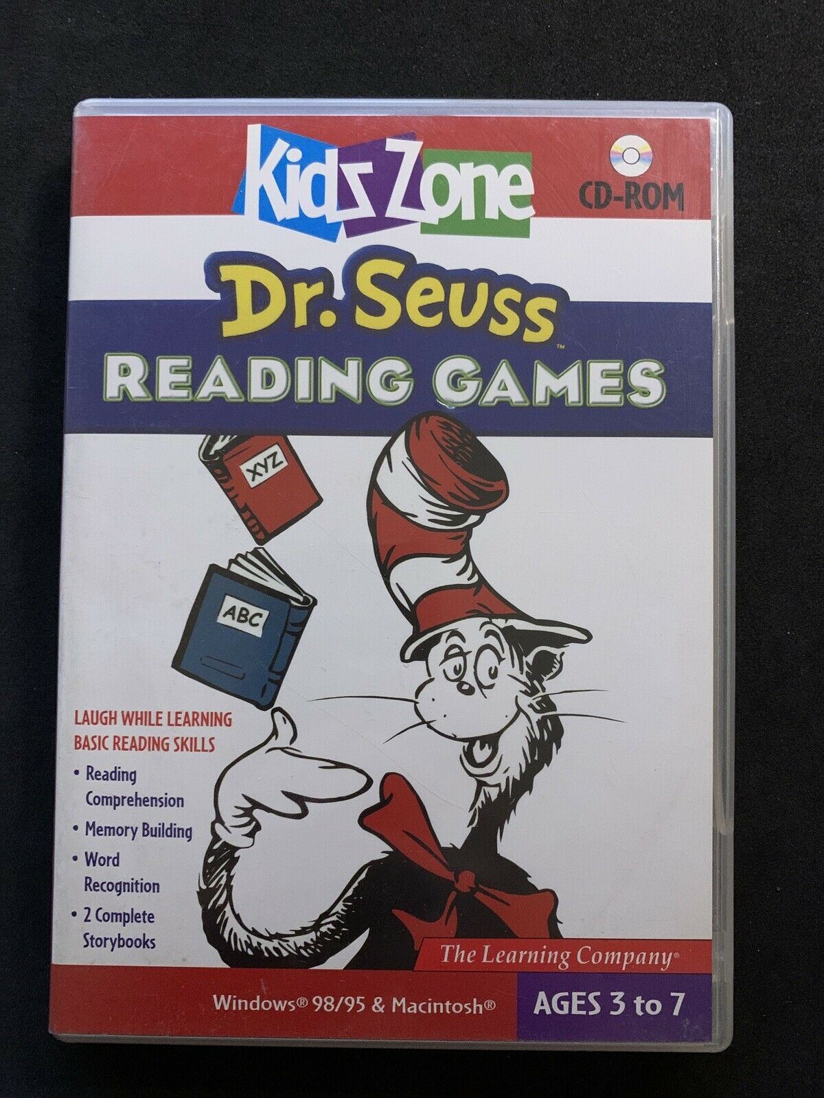 Dr. Seuss Reading Games is designed to teach basic reading skills in the wonderful and witty world of Dr. Seuss. Two of your favorite books come to life in this fun-filled CD-ROM. Dr. Seuss's ABC is designed for the beginner, and will introduce children to the ABC's of reading by making the connection between sounds, symbols, and words. In the ever-popular The Cat and the Hat, games and activities appear on every page. Both interactive storybooks include hundred of clickables and the ability to interact with the characters and objects on screen. (Ages 3-7)