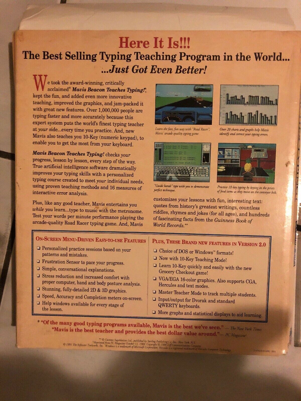 This may come as a shock, but there's no super-typist named Mavis Beacon. Les Crane, founder of Software Toolworks' parent company, made up the name for his ideal of the best typing teacher. Then he found a woman who looked like this ideal to pose for the picture on the box. The real Mavis Beacon is an artificial intelligence program with infinite patience, insight, and sensitivity to your frustrations. Mavis can do things no human teacher can do with over twenty charts and tables that analyze your typing. You'll even learn which keys are your strongest and which are your weakest. Many hail Mavis Beacon as the best typing-teacher program. The CD-ROM Windows multimedia version makes this winning program even better. It's called Mavis Beacon Teaches Typing: Version 2.0 for Multimedia (The Software Toolworks, 60 Leveroni Court, Novato, California 94949; 415-883-3000; $99.95). It not only can be used to train you to type what you read, but also what you hear. This version adds digitized speech and digital audio music, recorded in stereo, with the quality and clarity of CD-ROM based audio. Multimedia Mavis now has verbal dictation of 10 prerecorded letters, with the ability to add your own dictation letters. You simply use a utility program, such as Window's Sound Recorder, to create a way format file to go with a matching text file of the same name. Stop, go, and rewind controls simulate a dictating machine or tape recorder. The help topic has fourteen different voice-overs that let you read and listen to the help files. There's also a self-running spoken overview and demonstration of the program. This latest version still has some of the problems of the earlier versions. Keys typed after a mistyped letter are read as multiple errors until the correct letter is input. Settings for various learning configuration preferences still can't be saved and must be reset at the beginning of each session. Multimedia Mavis adds the convenience of Windows, with its task switching and built-in utilities, and the enhanced voice, sound, and music capacity of CD-ROM to this critically acclaimed, award-winning program. The latest incarnation of the oldest and best computer typing tutor is the best Mavis yet. |