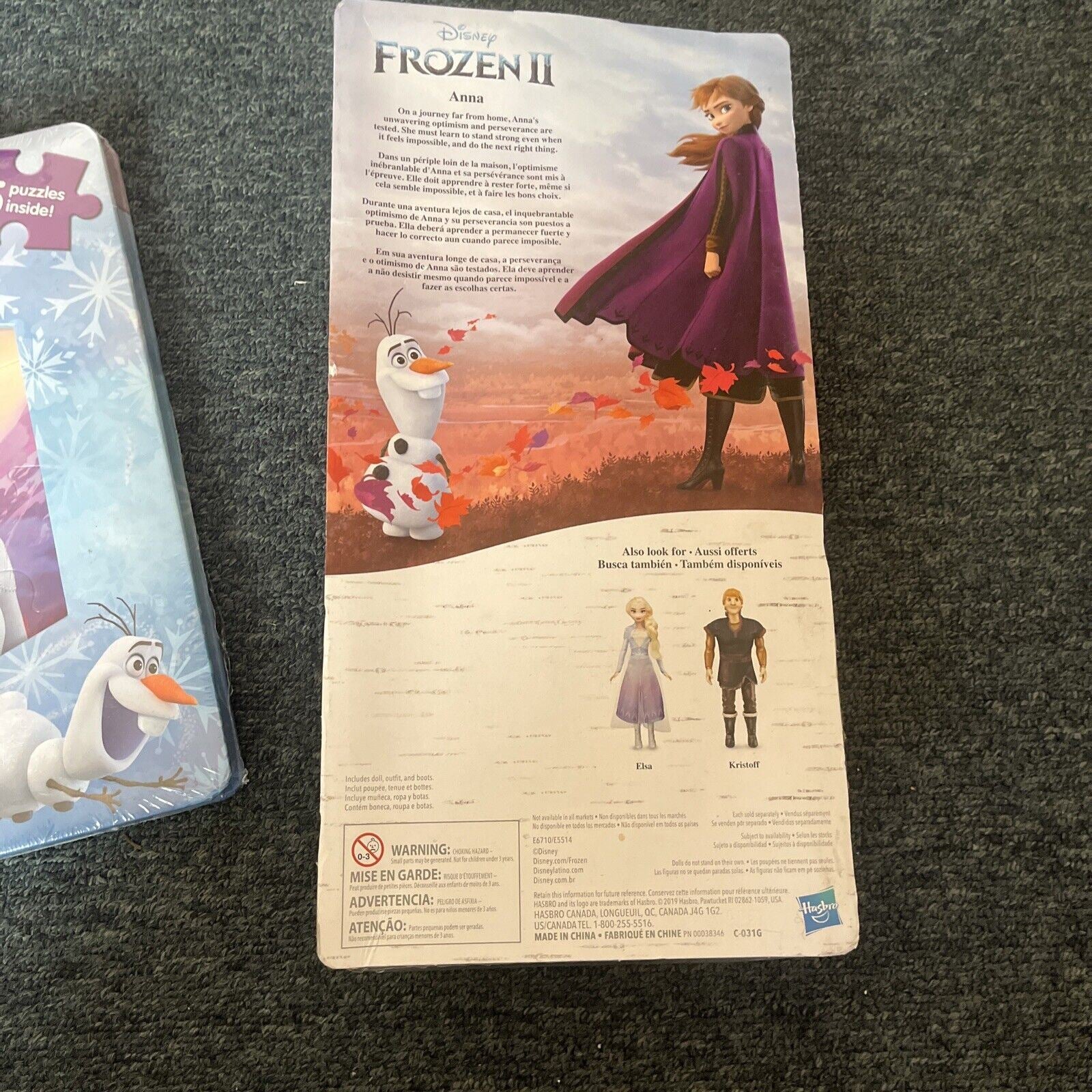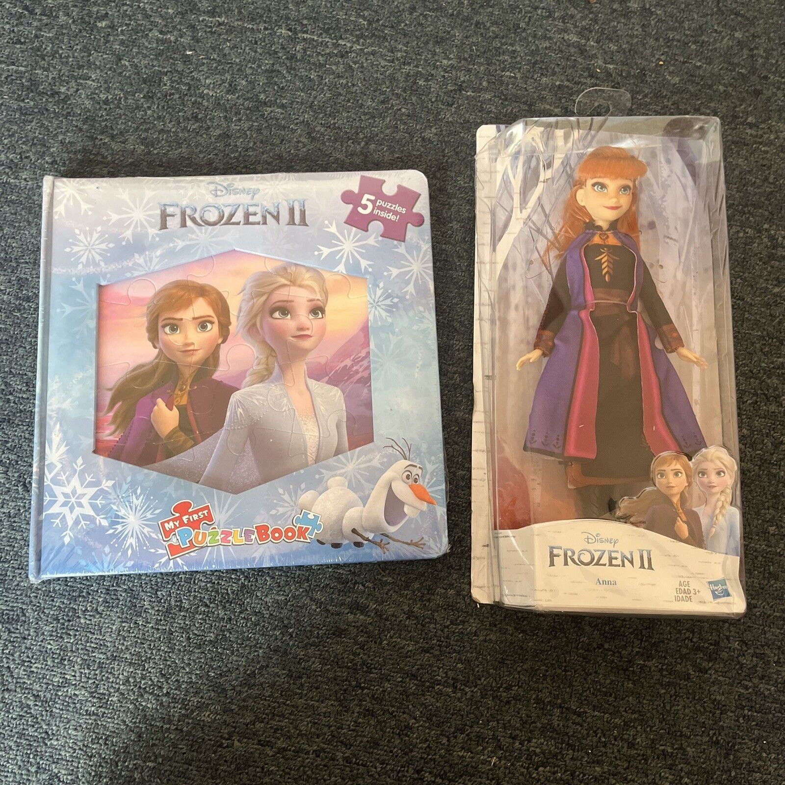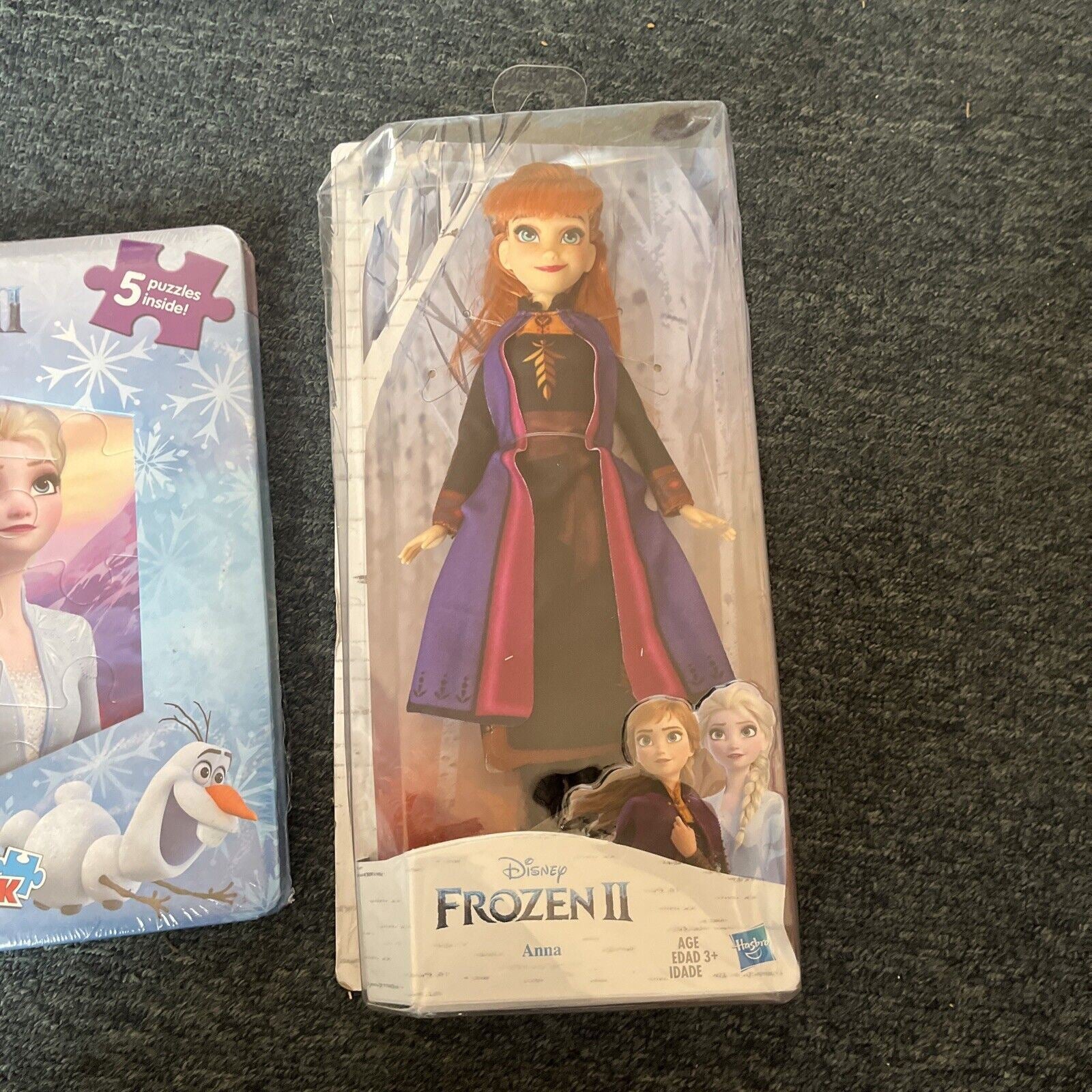 Includes puzzle book and Anna doll. The doll is new and never opened but the box is slightly crushed from storage.