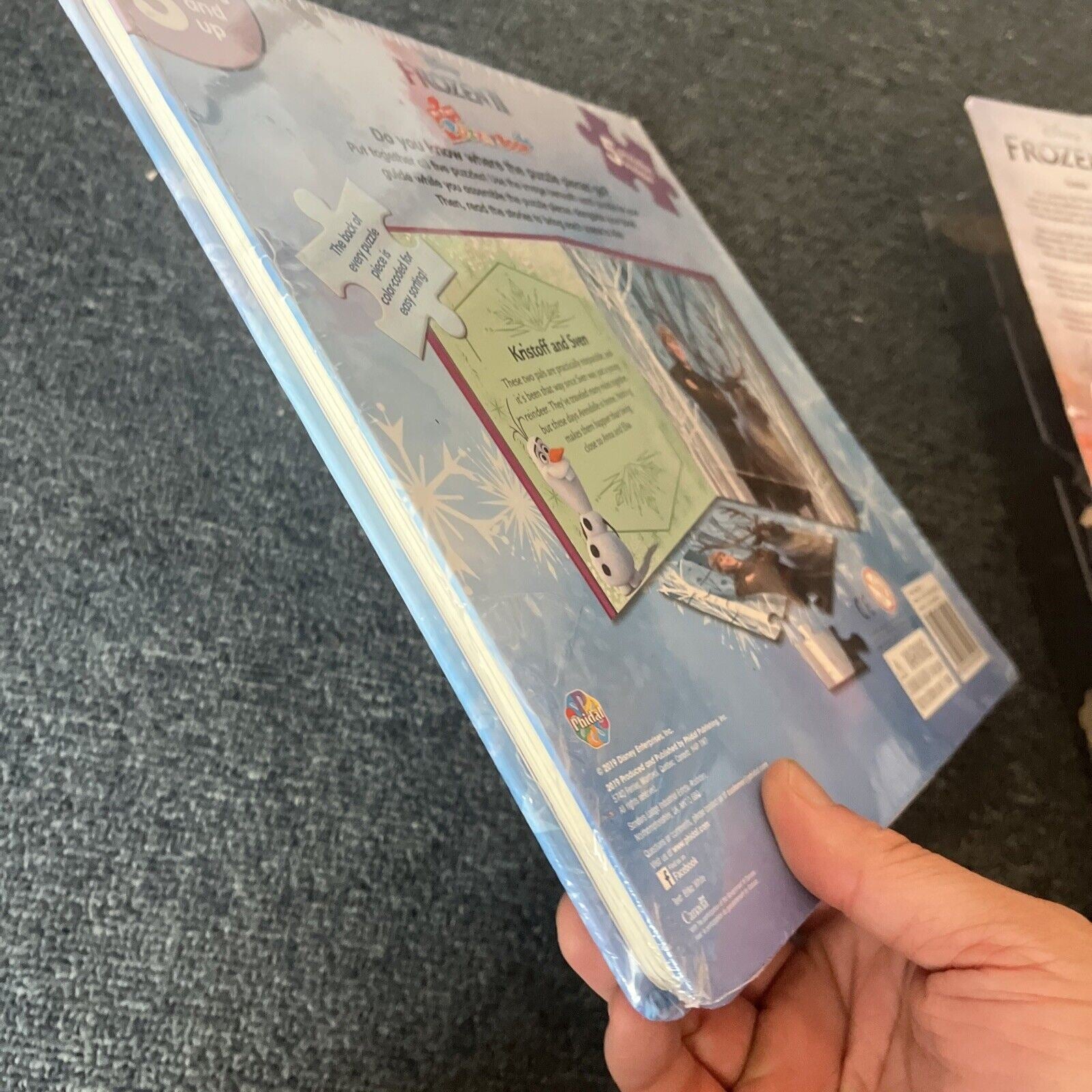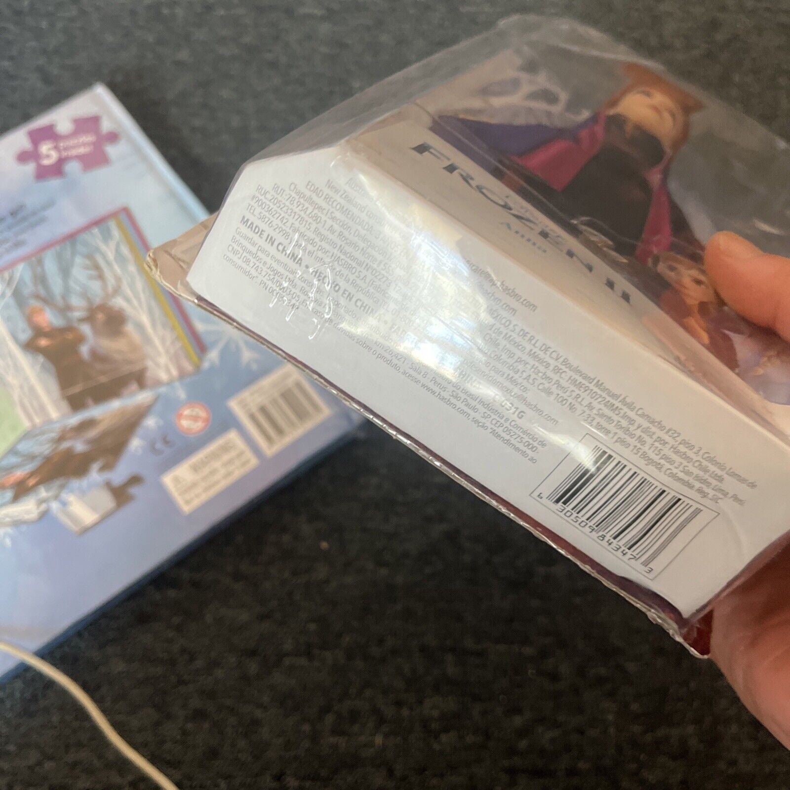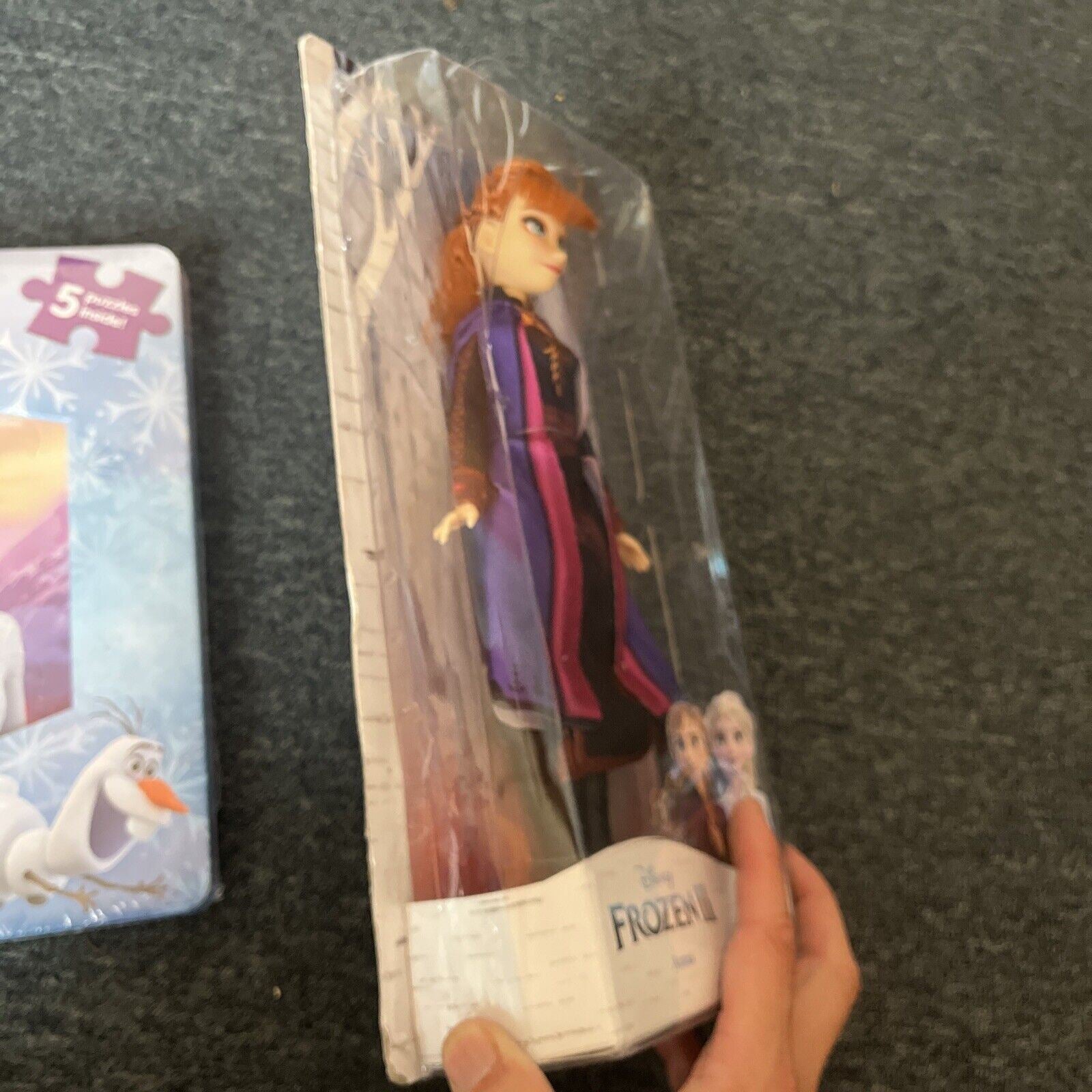 Includes puzzle book and Anna doll. The doll is new and never opened but the box is slightly crushed from storage.