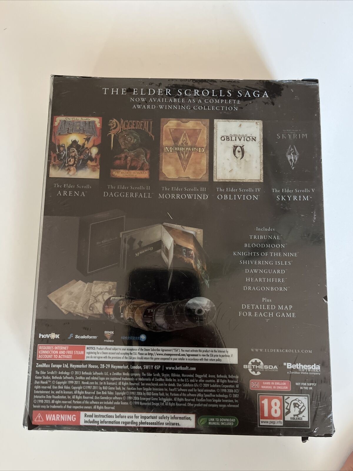 For the first time in the history of the award-winning saga, experience The Elder Scrolls as one extraordinary collection. The Elder Scrolls Anthology features all five critically-acclaimed games, plus official add-ons in a premium collectible box set - beginning with The Elder Scrolls: Arena and concluding with The Elder Scrolls V: Skyrim Legendary Edition. The Anthology also includes a set of five physical maps detailing Tamriel, Iliac Bay, Morrowind, Cyrodiil and Skyrim. Own this essential collection and experience the series that defined the open-world genre.- Arena: The Anthology features the original version of Arena and will launch within a DOS emulator.