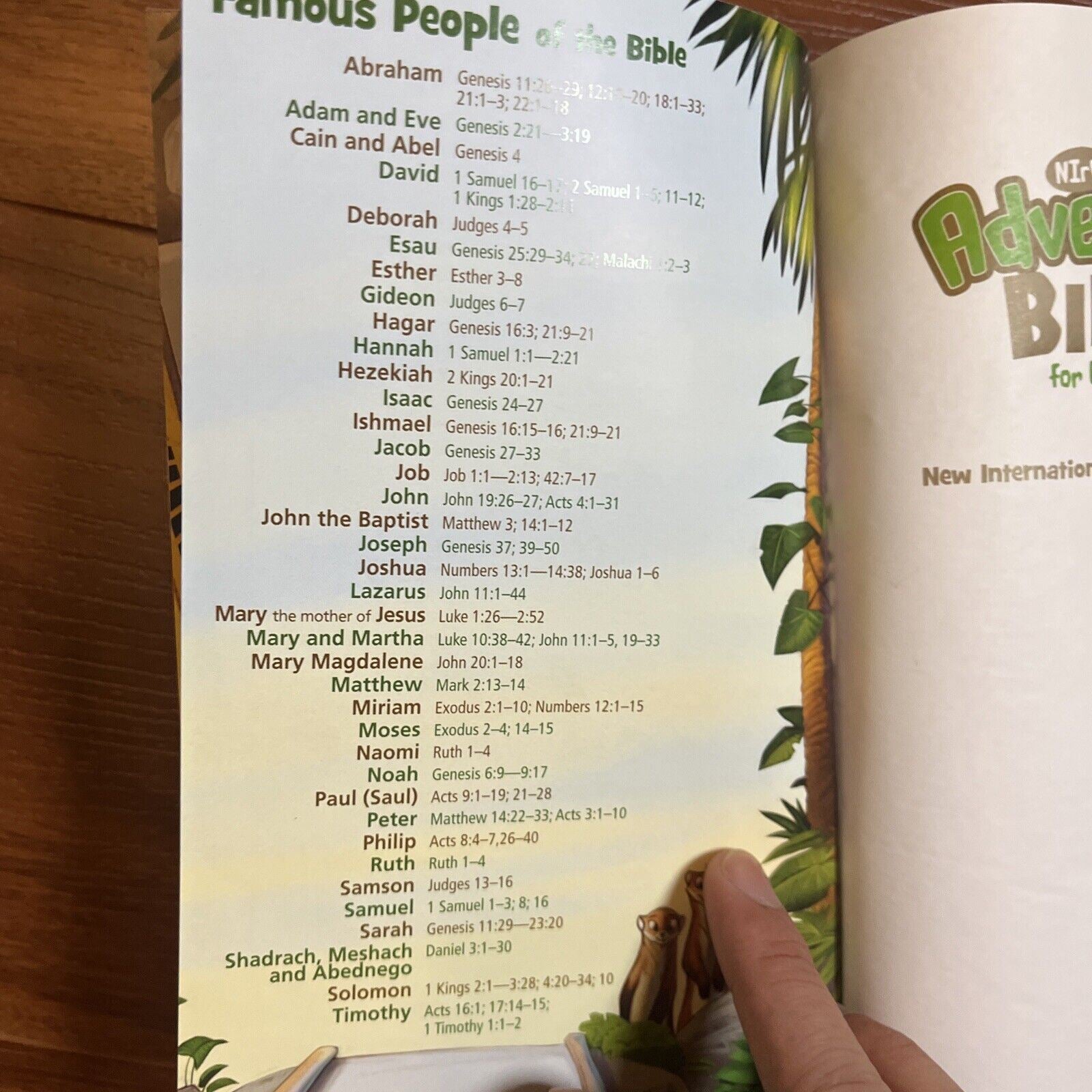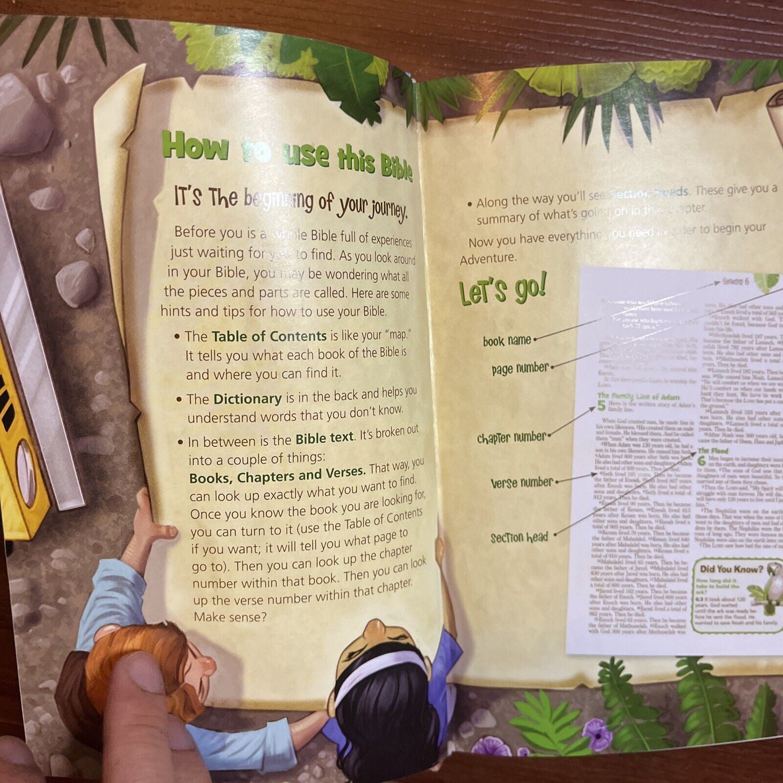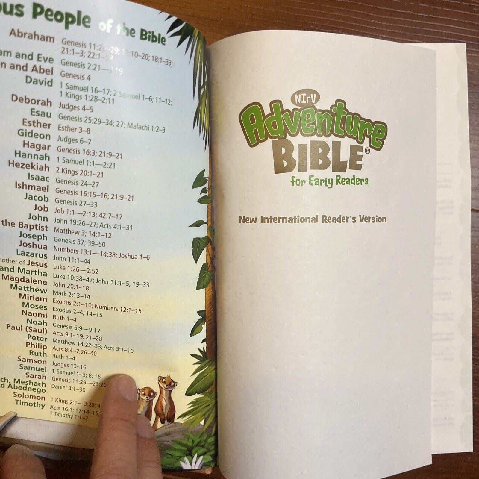 Ready for Adventure? The Adventure Bible for Early Readers takes you on a fun, exciting journey through God’s Word. Along the way you’ll meet all types of people, see all sorts of places, and learn all kinds of things about the Bible. Most importantly, you’ll grow closer in your relationship with God. Here’s a quick tour through the features: “Life in Bible Times” Articles and illustrations describe what life was like in ancient days “People in Bible Times” offer close-up looks at amazing people of the Bible “Did You Know?” provides interesting facts that help you better understand God’s Word. “Let’s Live It!” include hands-on activities to help you apply biblical truths to your life. “Words to Treasure” highlight great verses to memorize. A Dictionary/concordance for those tricky words. Book Introductions for basic facts about each book of the Bible (who wrote it, where it took place, and why it was written). 20 color pages with games, a scavenger hunt, and other Bible fun, with a jungle safari theme. 8 pages of color maps.