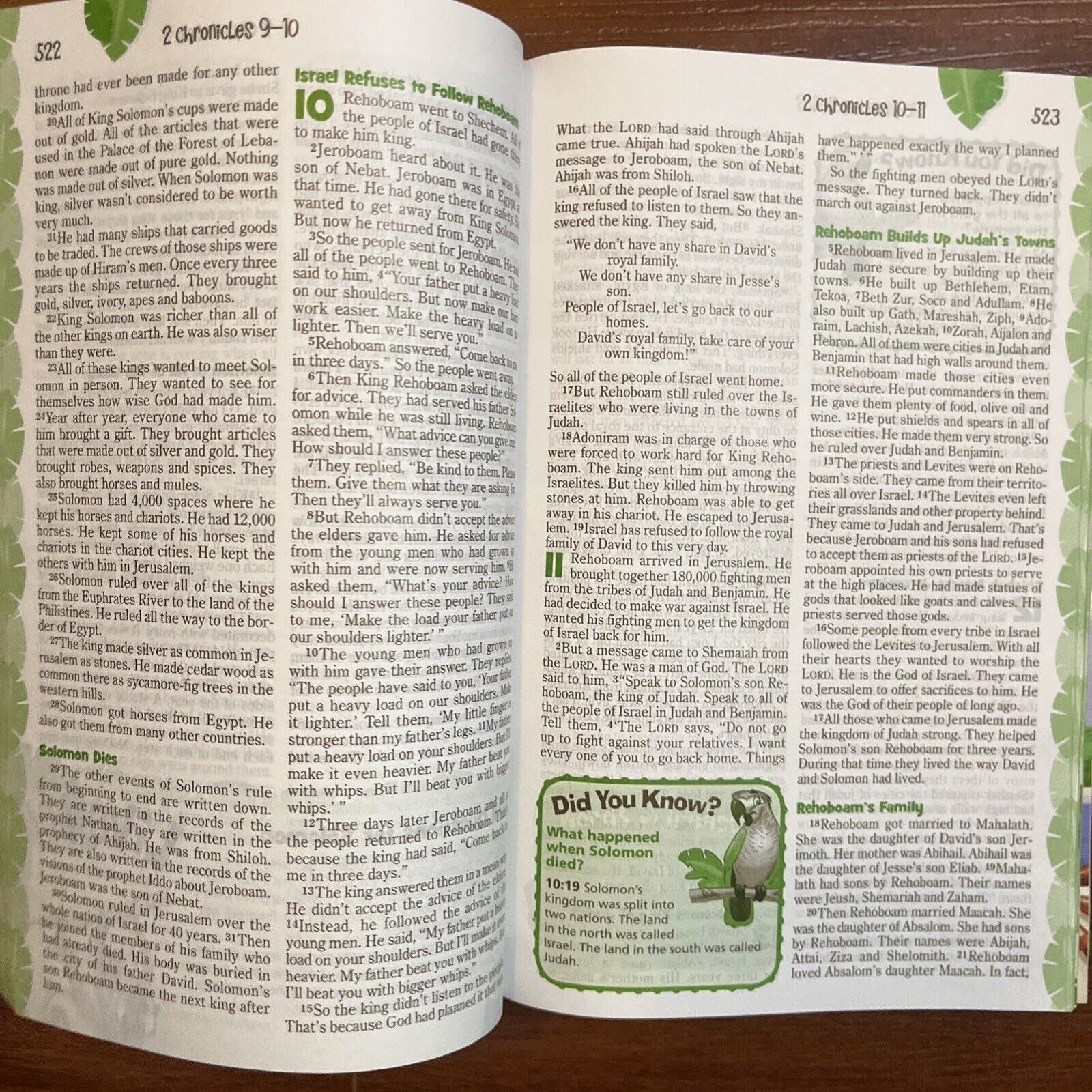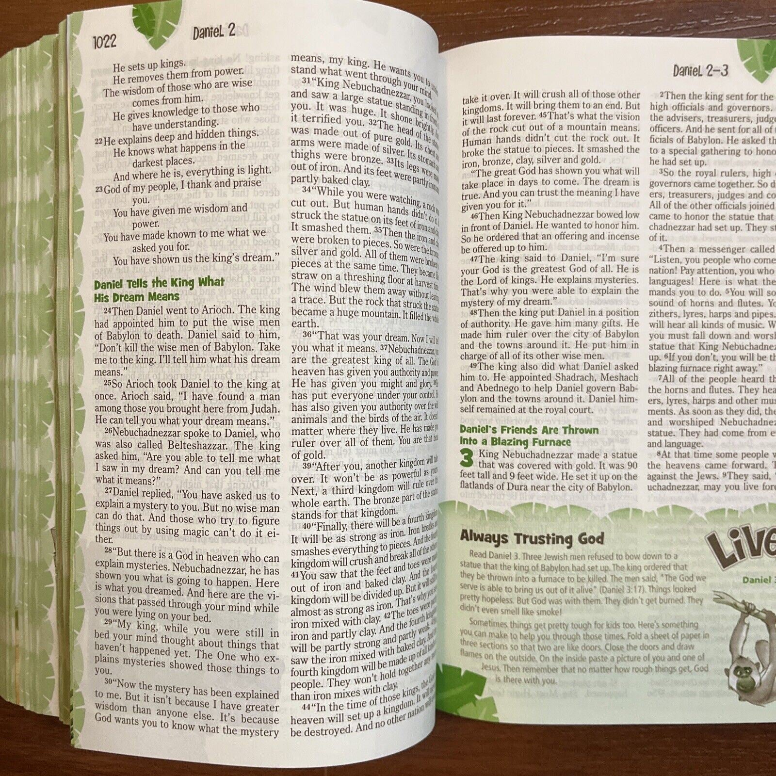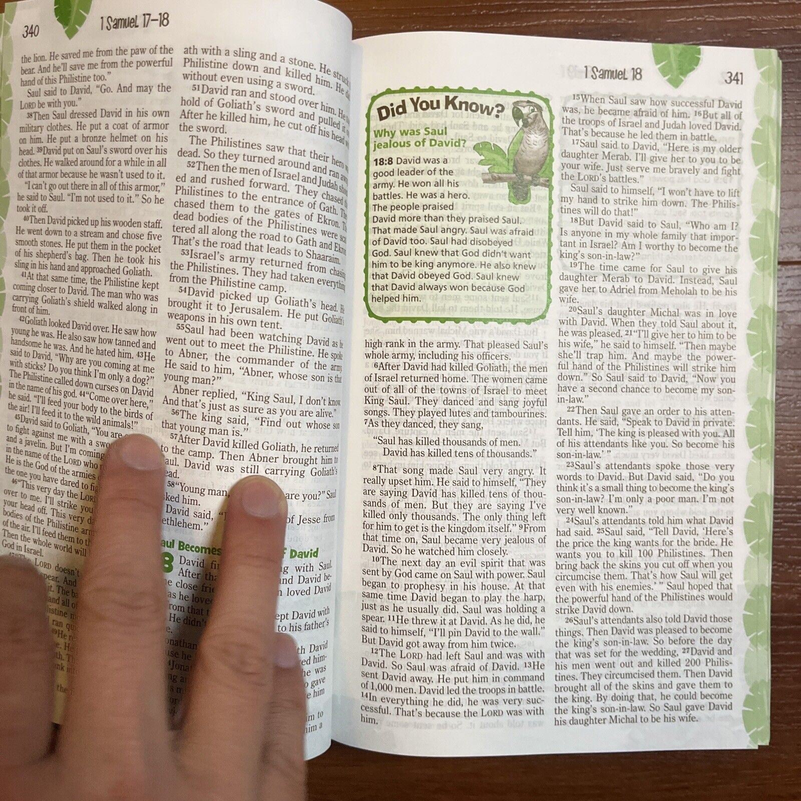 Ready for Adventure? The Adventure Bible for Early Readers takes you on a fun, exciting journey through God’s Word. Along the way you’ll meet all types of people, see all sorts of places, and learn all kinds of things about the Bible. Most importantly, you’ll grow closer in your relationship with God. Here’s a quick tour through the features: “Life in Bible Times” Articles and illustrations describe what life was like in ancient days “People in Bible Times” offer close-up looks at amazing people of the Bible “Did You Know?” provides interesting facts that help you better understand God’s Word. “Let’s Live It!” include hands-on activities to help you apply biblical truths to your life. “Words to Treasure” highlight great verses to memorize. A Dictionary/concordance for those tricky words. Book Introductions for basic facts about each book of the Bible (who wrote it, where it took place, and why it was written). 20 color pages with games, a scavenger hunt, and other Bible fun, with a jungle safari theme. 8 pages of color maps.