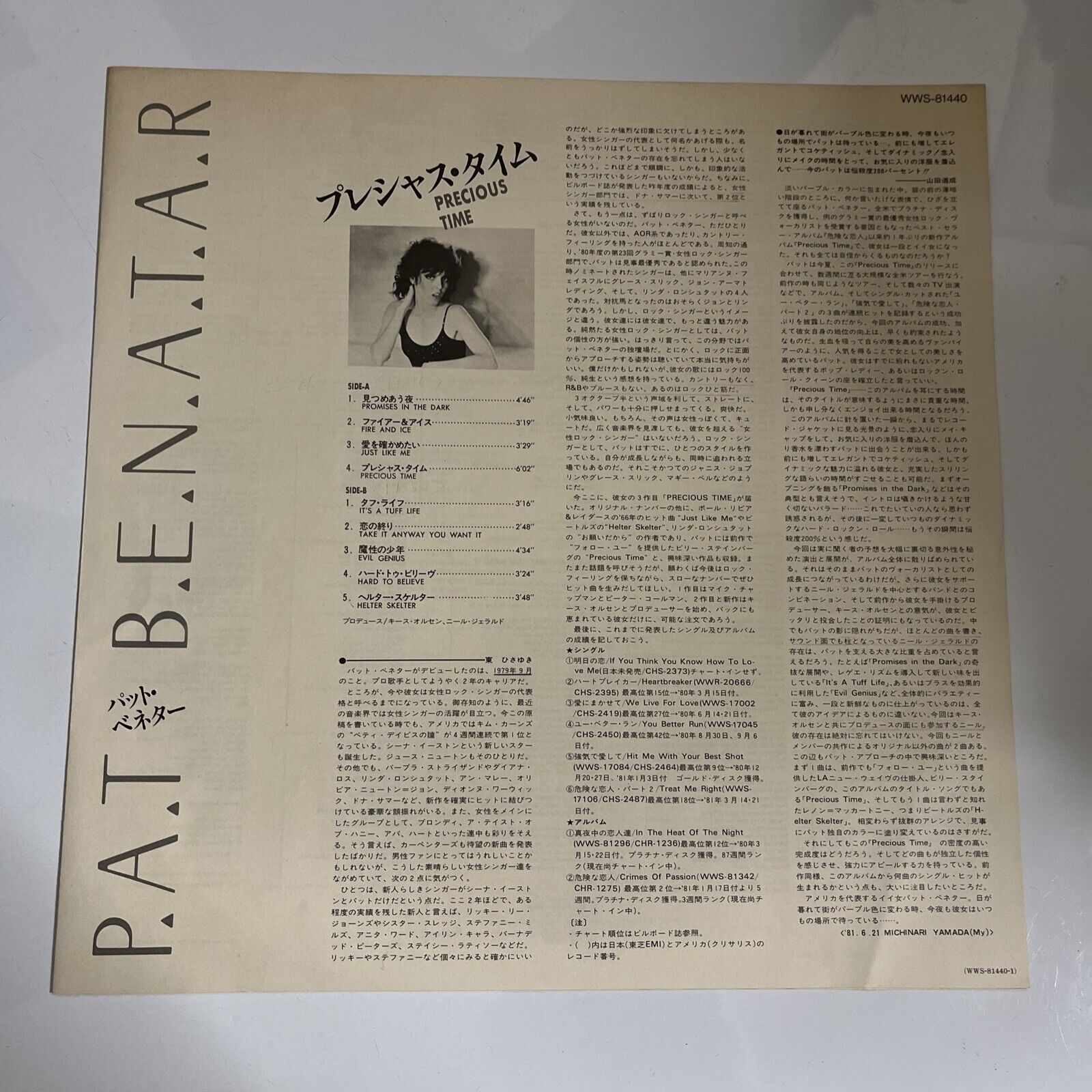 Pat Benatar – Precious Time 1984 LP Vinyl Record Chrysalis Japan WWS-81440
