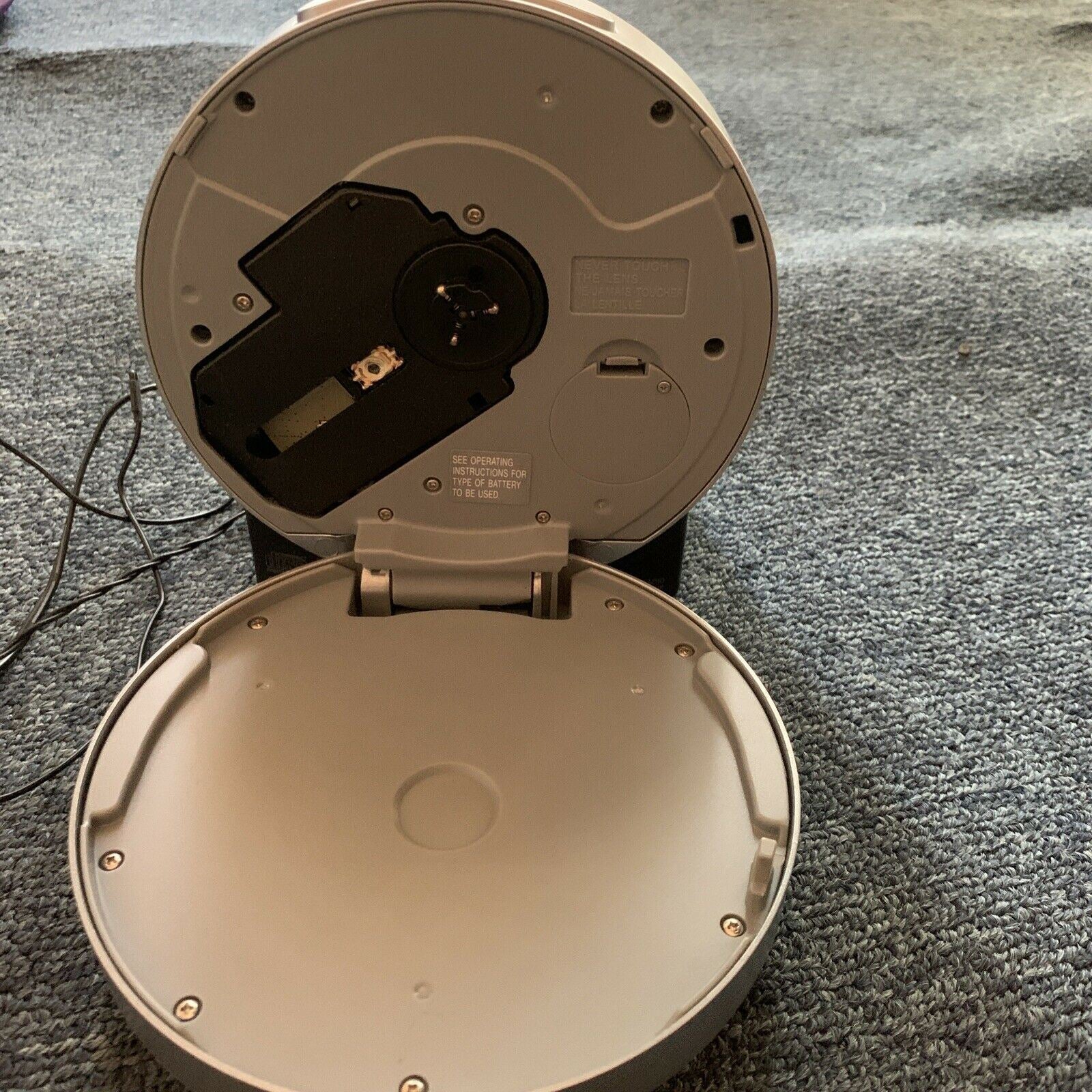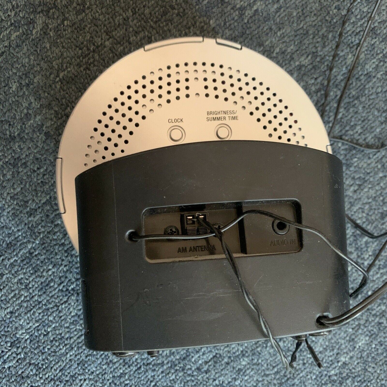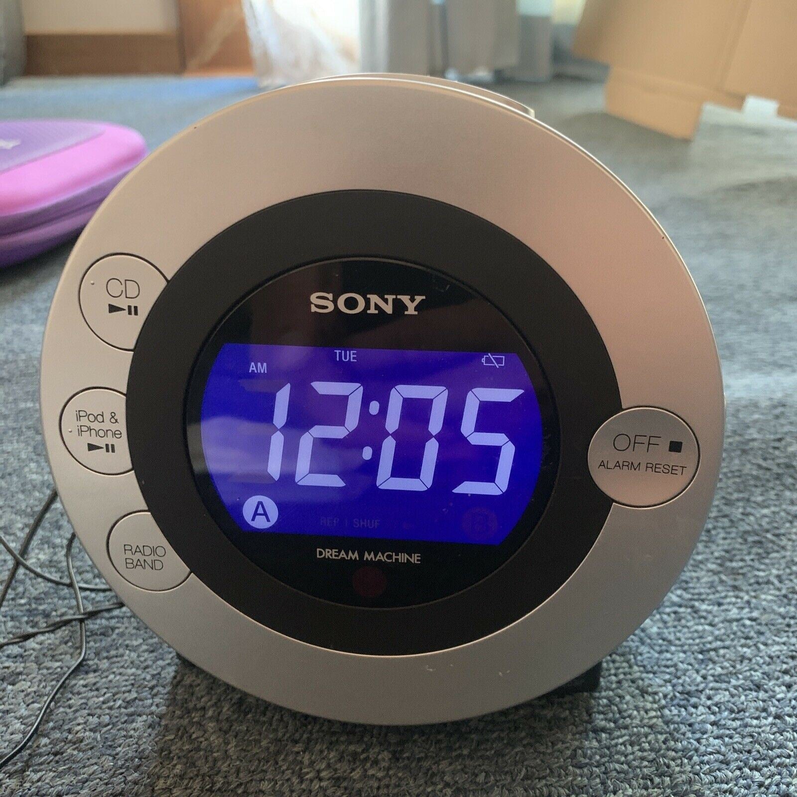 In good working order!The small, round-faced ICF-CD3iP is about as compact as iPod docks get, at 6.3 x 5.8 x 4.6 inches. A silver, circular face surrounds the LCD display and houses four buttons for play/pause, radio band, and off/alarm reset. The face itself pulls open to pop in your favorite compact disc. A large snooze button sits behind the CD bed, with sleep and volume buttons behind that. The dual-alarm clocks can be set and the radio can be tuned using buttons on either side of its face.