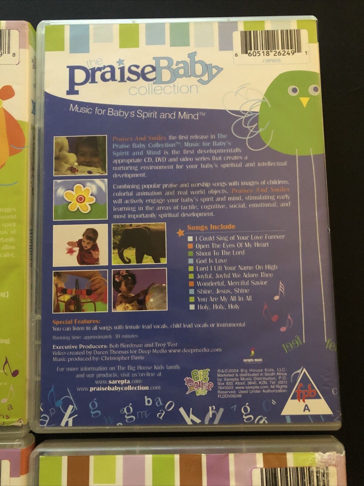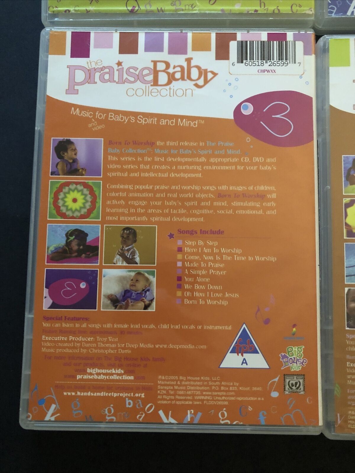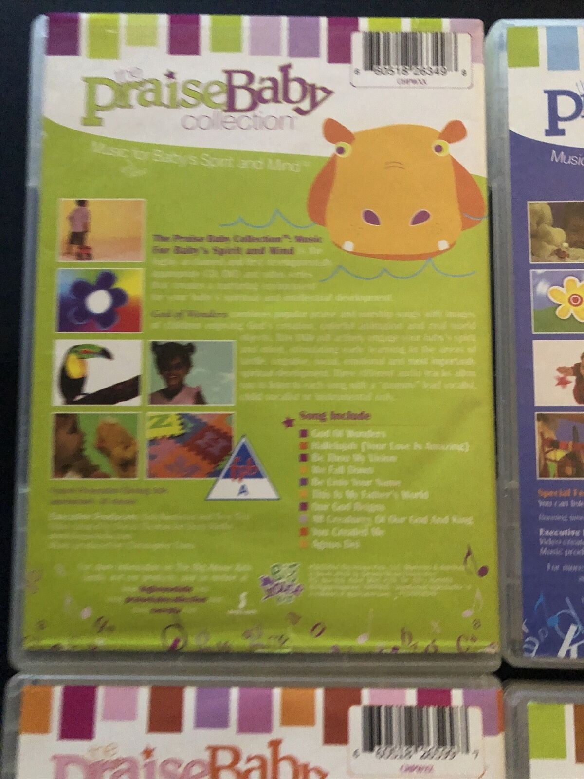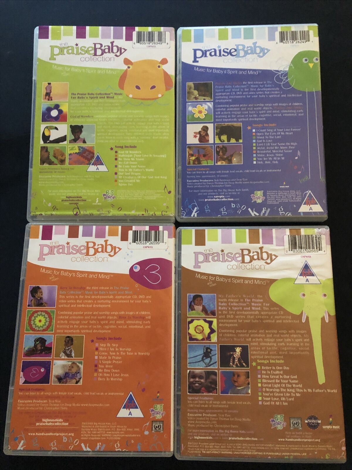 :The Praise Baby Collection 4 DVD set will nurture the environment for your baby's spirit and mind with worship music and fun interactive video. Combining popular praise and worship music with images of children playing, colorful animation and real world objects, these DVDs will also stimulate early learning in the areas of tactile, cognitive, social, emotional, and most importantly spiritual development. On these DVDs you'll find songs like, 'Shout to the Lord,' 'God of Wonders,' 'Here I am to Worship,' 'How Great is Our God,' and many more. Speacial DVD features allow you to listen to all songs with female lead vocals, child lead vocals or instrumental.