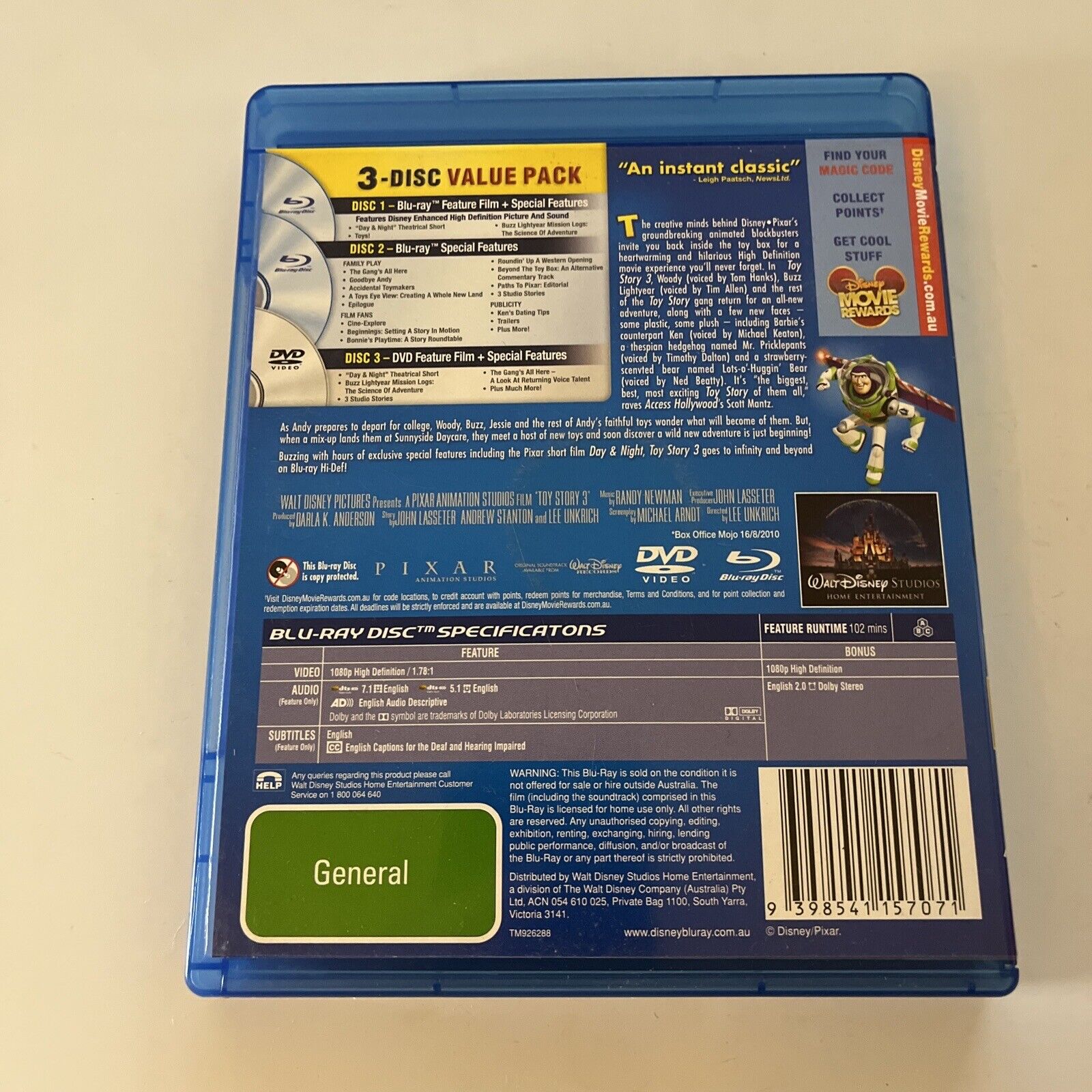 Buzzing with hours of exclusive special features including the Pixar short film Day & Night, Toy Story 3 goes to infinity and beyond on Blu-ray Hi-Def!